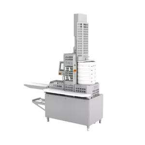 An outfeed conveyor in ergonomic height is transporting the portions to the following process.